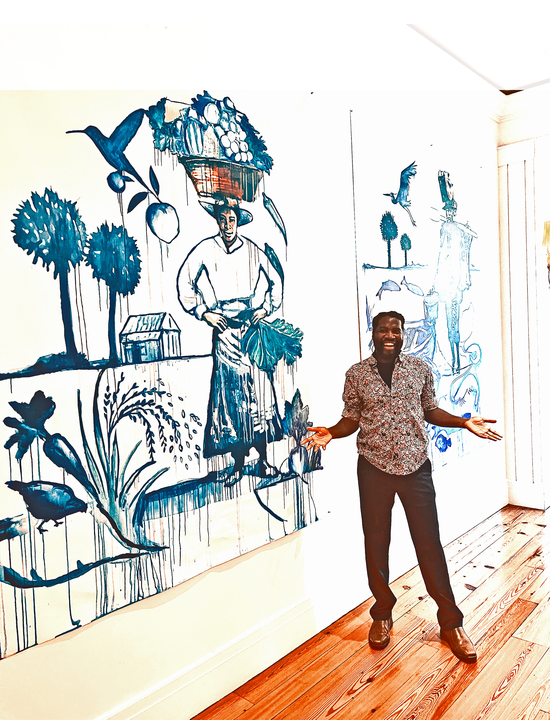 Surrounded by the natural beauty of the Lowcountry, the composition features herons, oysters, a marsh tacky horse rider and flowing waters, all connected through indigo hues and fluid drips that represent the passage of time and the enduring connection between Gullah people and the connection between Waterland and people.