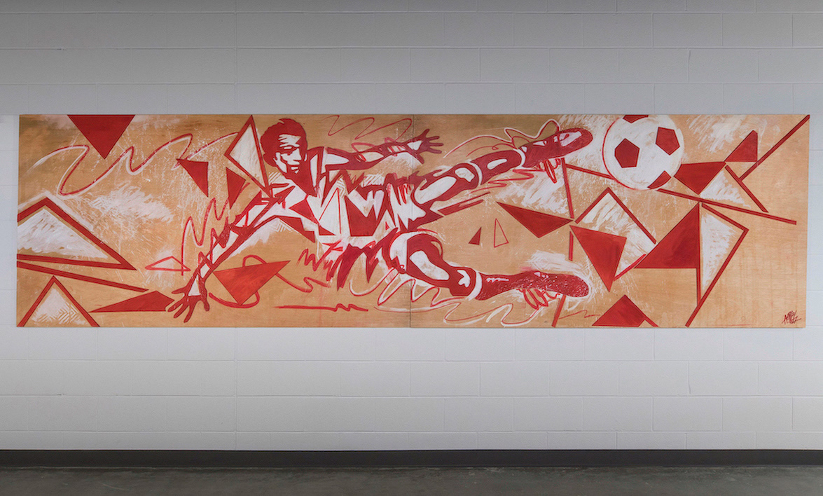 This piece is all about capturing the energy and motion of the game. I wanted to show the power and grace of a soccer player in mid-action, caught in that intense moment of a strike. The angular shapes and bold red tones are intentional—they emphasize the dynamism and excitement that soccer Ender also sheep’s found in the logo and original design of the stadium. The geometric forms, like the triangles and zigzags, are my way of visually echoing the rhythm and movement on the field. I kept the palette simple with reds, whites, and earthy tones to create contrast and focus your attention on the player and the ball. celebrating the sport, the passion behind it, and the energy that fills a place like the Mercedes-Benz Stadium.