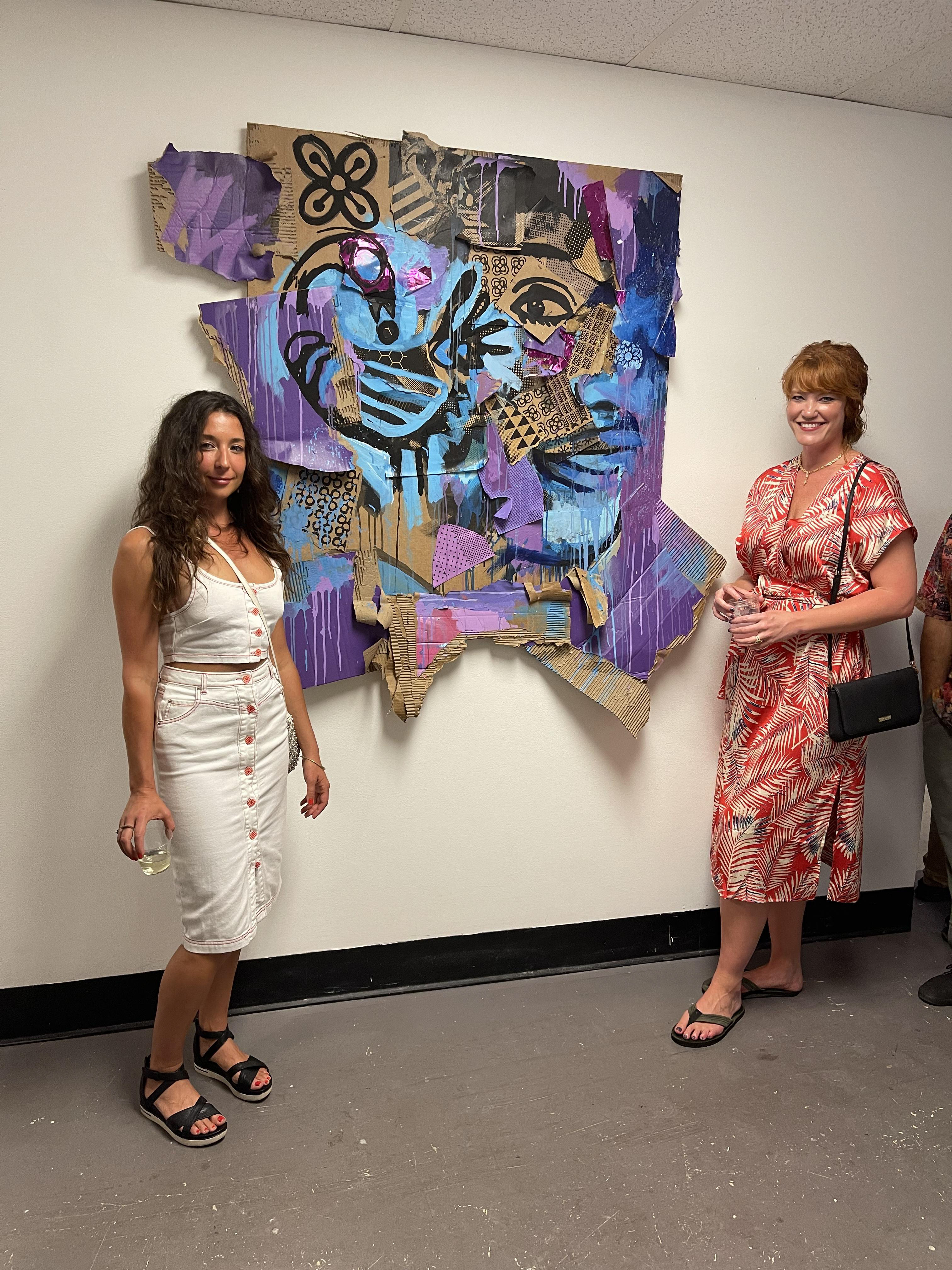 Here I am working in the studio, preparing for my exhibit at the Jepson Center, Telfair Museum in Savannah, Georgia. For the background, I flattened and combined cardboard boxes, collaging different sections together to create figurative faces. My goal was to make them appear abstract yet familiar, using exaggerated features to capture the attention of passersby through the Jepson Center’s windows. As I continued developing the pieces, I incorporated more cultural elements—layering paper, cardboard, paint, comics, and glitter—utilizing a variety of materials I had available in my studio to bring the series to life.