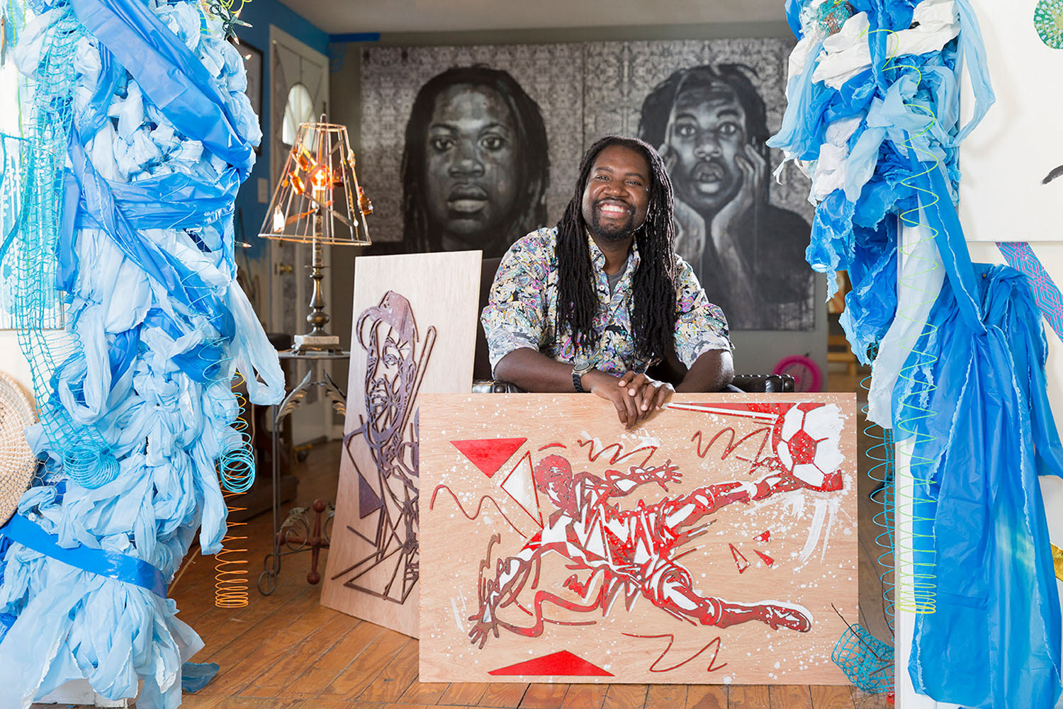 Here I am working in thestudio, surrounded by some of my work and creative elements. In the foreground, you can see the original mock-up design for the artwork I created for the Mercedes-Benz Stadium in Atlanta. I worked through quite a few designs before finalizing the piece, refining the composition and energy until it felt right for such a dynamic public space. Worked on. Moving feel irritated or sometimes I use these creative initial stages into a large-scale finished piece that connects with such a broad audience.